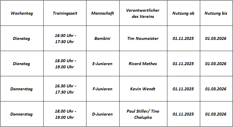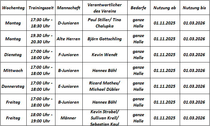 Trainingszeiten Belegungsplan Sportplatz Pausa (bis 31.12.2025) Belegungsplan Sportplatz Mühltroff (bis 31.12.2025) Belegungsplan der Turnhalle Pausa Belegungsplan der Turnhalle Mühltroff